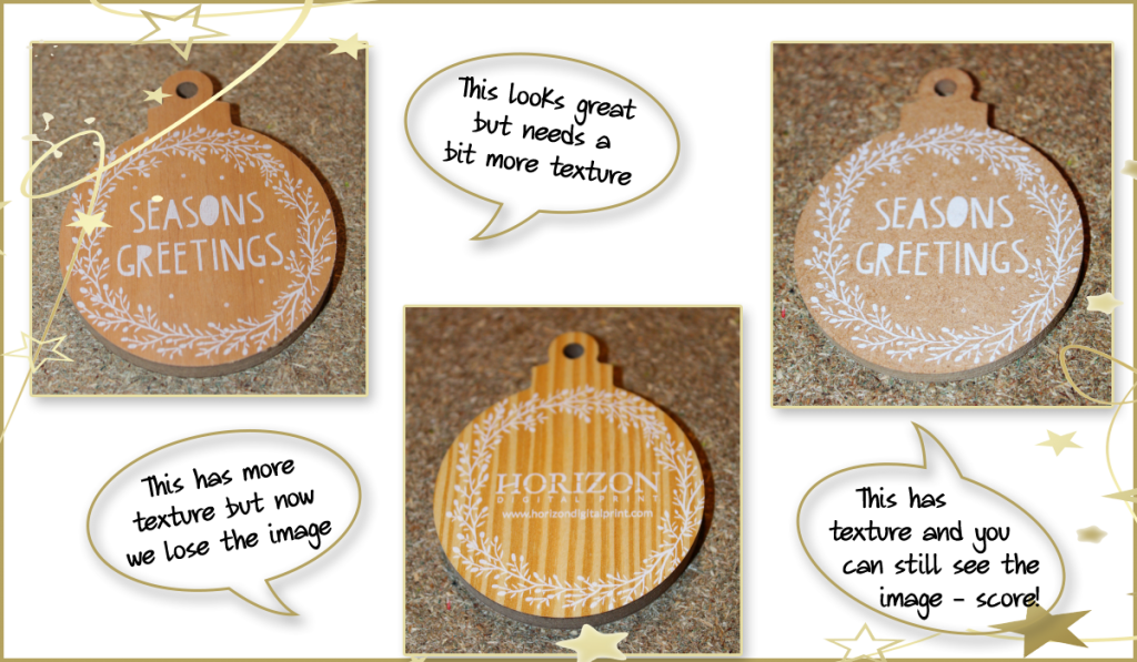 Then it was time for our print samples. We wanted to use high quality wood so that the wood become part of the design. When we printed on it however we were disappointed with the results and ended up using MDF as it looked the best. Sometimes the simplest materials really work the best!
